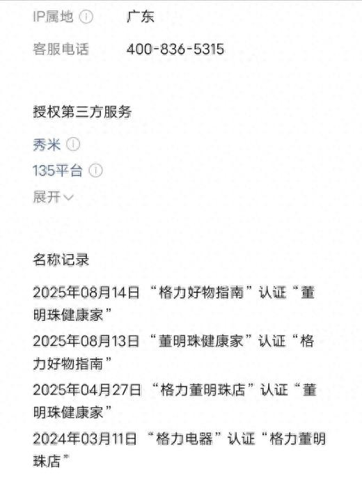 2025年04月27日,“格力董明珠店”认证“董明珠健康家”;2025年8月13日,“董明珠健康家”认证“格力好物指南”。